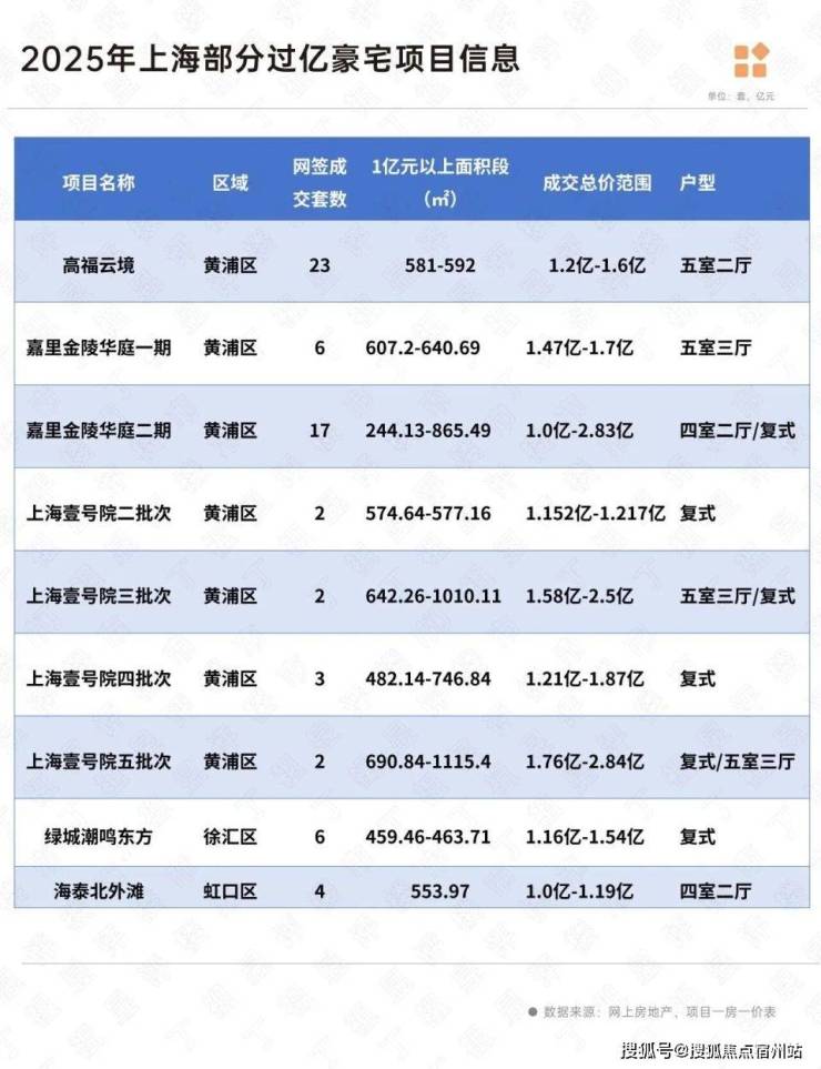 我们统计了2025年上海过亿豪宅网签成交情况,上半年上海壹号院、嘉里金陵华庭和绿城潮鸣东方三个项目就推出了16套过亿豪宅,其中绿城潮鸣东方6套总价超1亿元的顶复,最贵的一套接近1.54亿,开盘当天便一售而空。