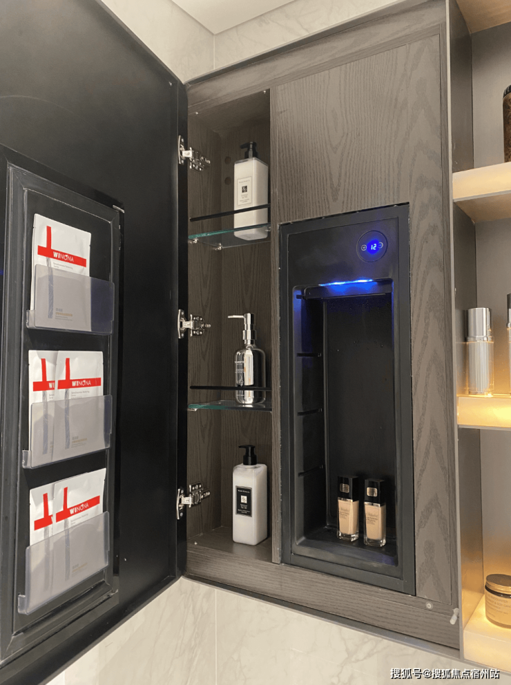 奢石台面,皮革饰面柜抽屉,侧端设置金属收纳开放格;定制镜柜,中间的透光玉石直接提升了高级感, 镜柜内部配备了美妆冰箱+美妆灯条+轨道收纳!