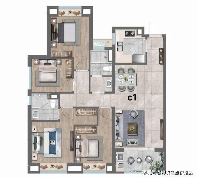 C1户型:建筑面积约127㎡4房2厅2卫