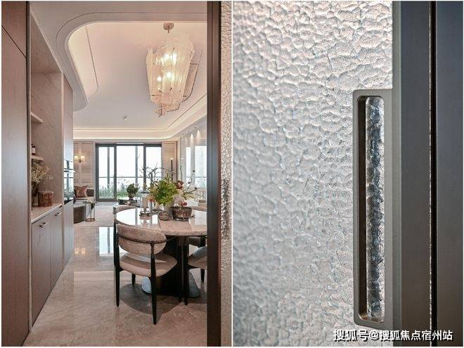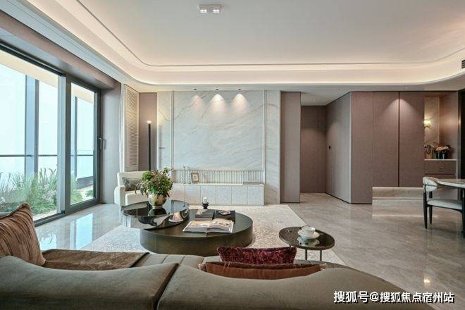 门口门牌号背景采用芬迪白奢石,客厅沙发背景墙采用影木木饰面和皮革造型,电视背景墙则用云纹白金沙石材;此外室内还大面积运用昂贵的影木木饰面,从入门瞬间就彰显高端格调。