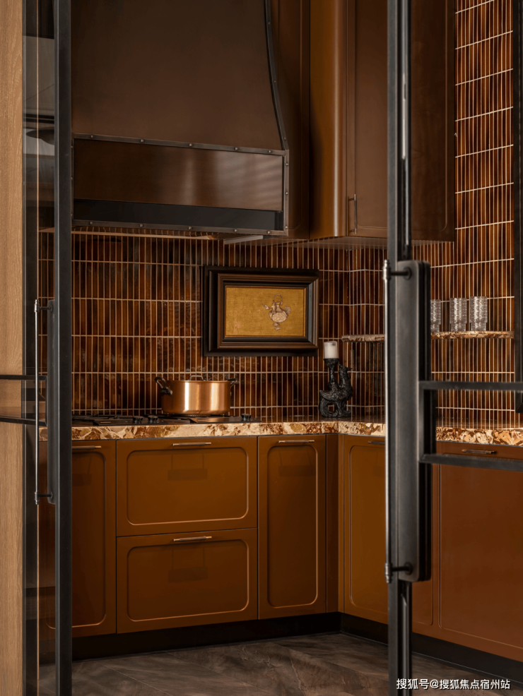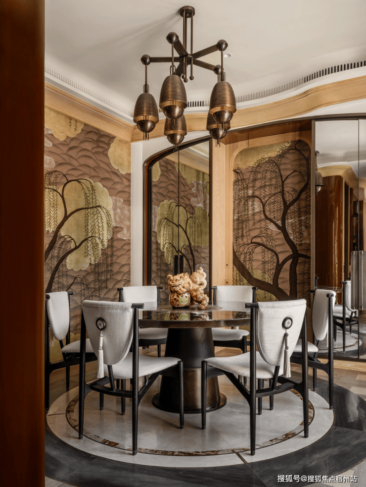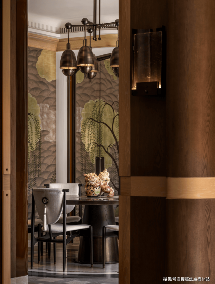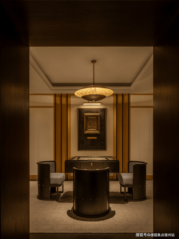 餐厅延续经典装饰艺术美学,以深绿色奢石餐桌、珠光椅面与手工金属吊灯营造低调而华丽的用餐氛围。从餐厅步入家庭室,将自然优雅与文化深沉融为一体,空间在静谧中流露复古气息。