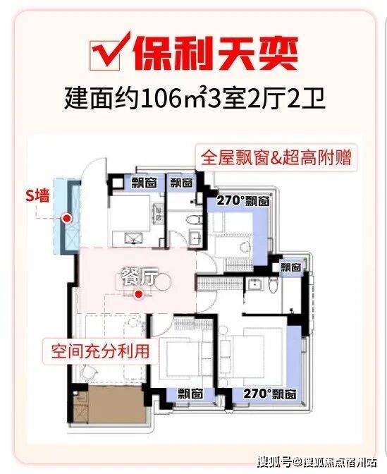 保利天奕建面约106㎡户型不仅做到“全屋飘窗”,面积更是达到了夸张的9.57㎡,比一间常规次卧都大(以实际交付为准)