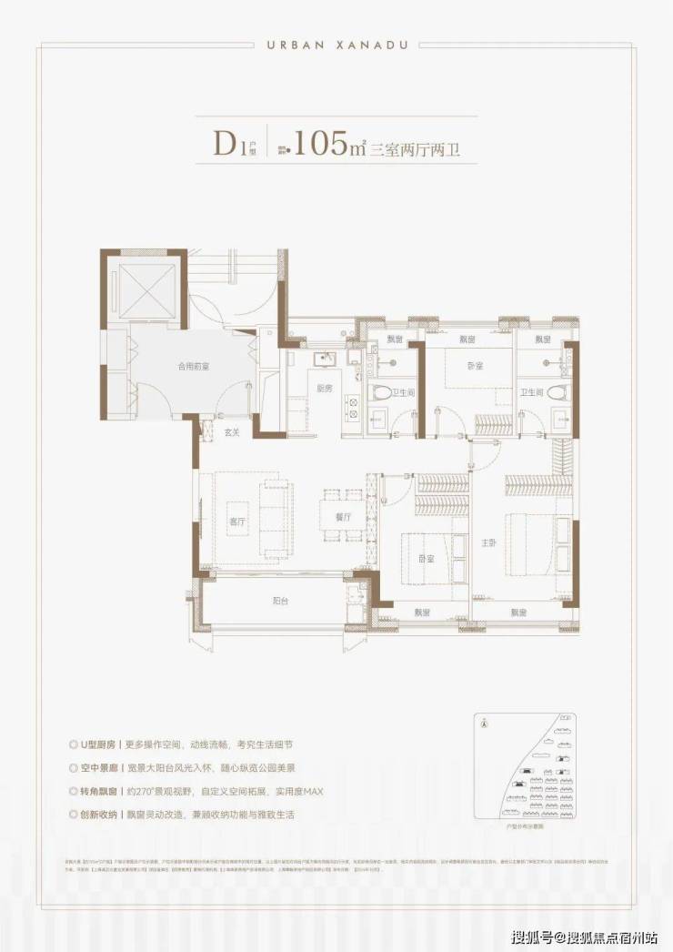 主力户型建面约105㎡3房2厅2卫,分为边套和中间套,都是 三开间朝南+主卧套房设计+多个飘窗+双联阳台, 适配不同居住习惯的家庭。
