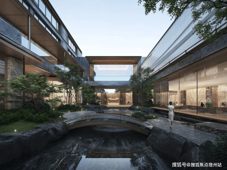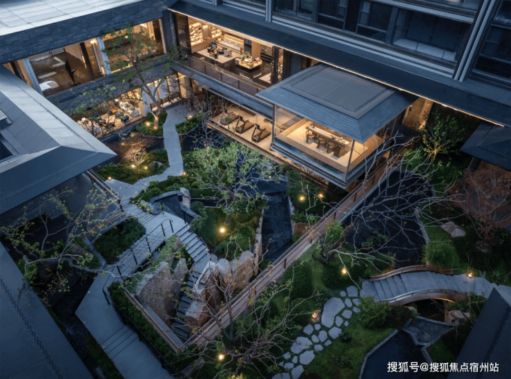 而整个社区的点睛之笔,当属约6米地势差打造的下沉式山水庭院。沿着蜿蜒的石阶走下去,仿佛瞬间闯入了一方隐秘的江南秘境:太行金景石层叠成丘,纹理自然,颇有“虽由人作,宛自天开”的意境;岭南古桩铁冬青与原生乌桕树相映成趣,枝繁叶茂,撑起一片浓荫;瀑布落溪、溪转成涧,潺潺流水声萦绕耳畔,雾气在水面轻轻弥漫,搭配菖蒲、千屈菜等水生植物,让“山水”不再是远观的画卷,而是可步入、可触摸的生活场景。社区还融入了“全龄化”园林设计理念,配备了450米环形跑道、约1200㎡全景架空层与私家会所。
