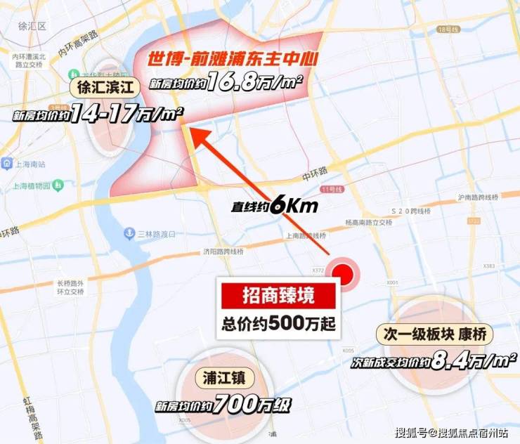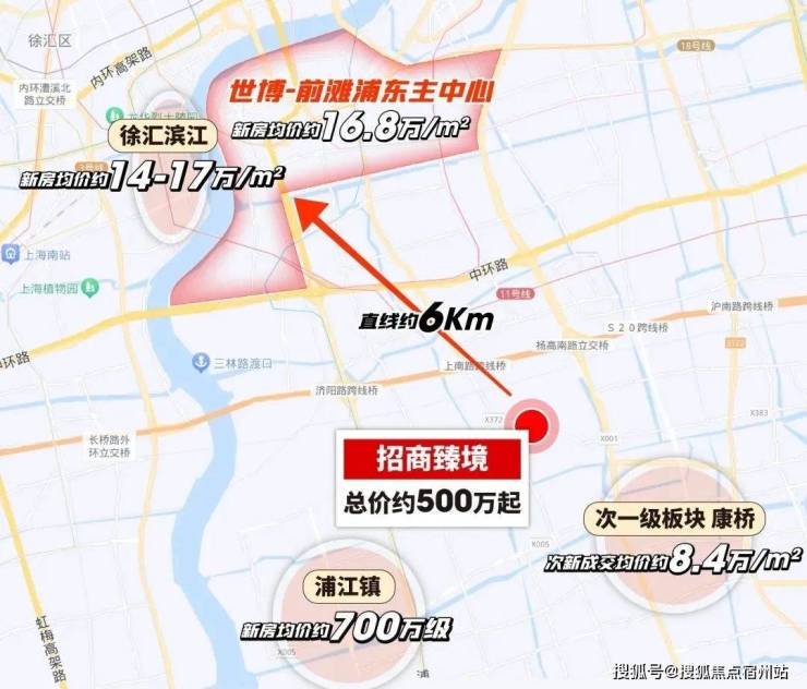 而以前滩、世博为中心,画三个直线约5-7km的生活圈,招商臻境是唯一一个约500万起的新房,而其他的选择,总价起码千万起。