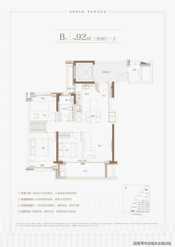 主力户型建面约92㎡3房2厅1卫,户型 三开间朝南 、再加上“ 2个飘窗+双联阳台 ”,不管是采光、视野、通风、私密性,还是实用性都十分出色。
