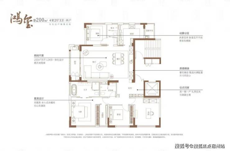 建面约200㎡4房2厅3卫 户型,做到了 三开间朝南+主卧豪华套房设计+南北通透 ,保证每个家庭成员都能有自己独立的居住空间,私密性拉满。