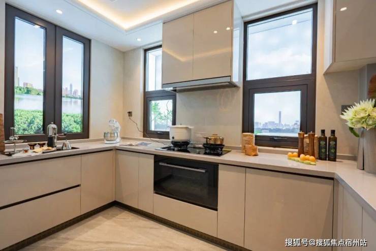 项目厨房使用 方太 的灶蒸烤一体机、吸油烟机 三件套交付,更有 弗兰卡 的水槽、龙头,定制橱柜, 诺贝尔 的地面、墙面,石英石台面等