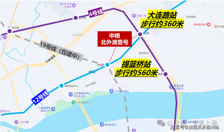交通方面,项目位于上海内环内,距离轨交4号线大连路直线距离约250米, 周边4、12以及在建19号线三轨交汇, 交通便捷。