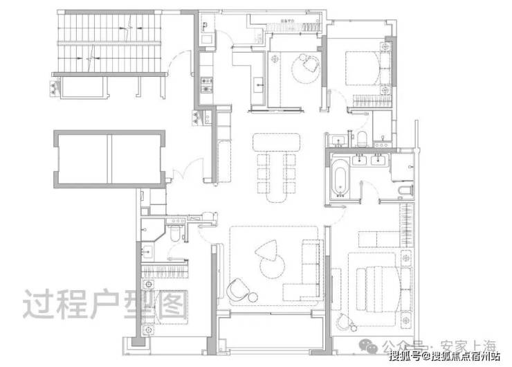 该户型均为边套,拥有更私密的居住体验和客餐厅阳台连续17米的无遮转角景观面,户型尺度更为阔绰,客厅采用转角采光,最大化引入景观;主卧套房尺度奢华。因为建筑立面正面北外滩世界会客厅,东西边套阳台可直观欣赏北外滩的未来城景,东边套部分房源甚至能将陆家嘴“三件套”框入每日窗景;西边套依旧视野通透,南北无遮挡,西向有下午的采光优势,高区房源完全任何遮挡,视野价值巨大。它代表了项目对高端居住体验和稀缺景观价值的顶格兑现。