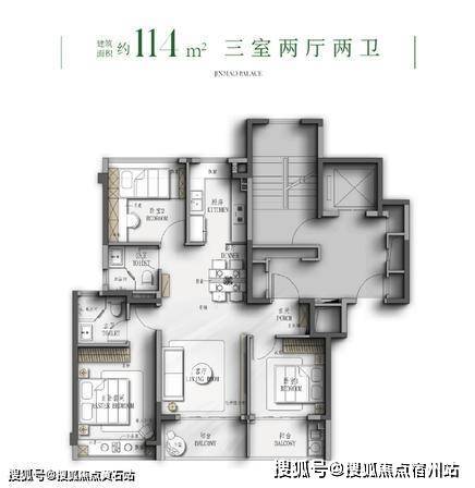 建面约 114㎡ 3 房 2 厅 2 卫(总价约 815 万起) 经典入门改善户型,格局方正无浪费,南向三开间面宽约 9.6 米。客厅与次卧联通约 9.28㎡超大阳台,采光视野拉满;主卧套房带独立卫浴、观景飘窗,双卧朝南,全明通透,是低总价上车金茂府的优选。
