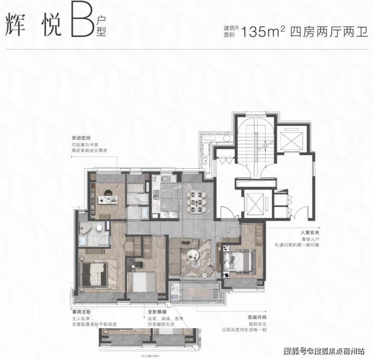 大家气度:约7.2米的纵横社交宽厅,搭配4+1房的空间弹性,为家庭成长与圈层交往提供了从容场域