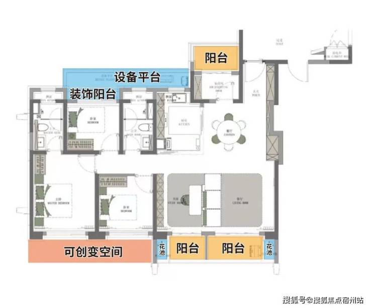 建面约122㎡3房,这个面积做3房,同时还附加了3阳台+飘窗+可创变空间等优势。