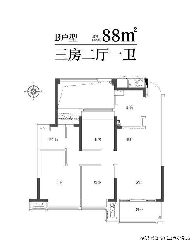 建筑面积约88㎡精雅三房一卫 ,三口之家理想
