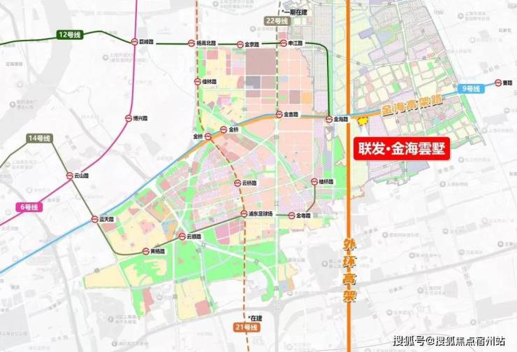 轨交层面,项目位于9/12号线金海路—顾唐路之间,直线距离金海路站约600米;14号线桂桥路站约2公里。