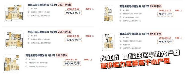 一方面,大虹桥有标杆项目珠玉在前。比如西郊庄园马德里洋房,其90㎡二手房成交价约7.5万/㎡,但260㎡就高达约8.6-9.8万/㎡,大户型溢价更高。