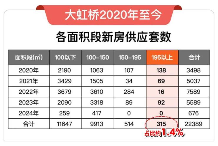 2020年至今,大虹桥共供应22389套新房,其中建面约195㎡以上户型仅315套,今年为止更是0供应(截至2024.4.9),占比只有约1.4%。