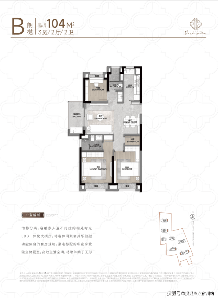 再看建面约104㎡B户型:该户型多为楼栋的边套,是一个观景户型。客厅连接270°阳台,视野出众。双卧朝南,阳光满溢。从次卫布局看,如果家庭人口较少,该户型还能做成双套卧。