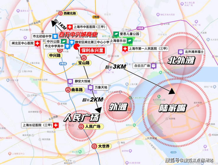 「交通方面」:项目三轨环绕,最近8号线中兴路站,3/4号线宝山路站均在约500m内;串联人民广场、陆家嘴,静安寺等中芯区域。