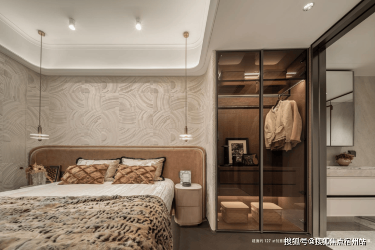 主卧延续了客厅的定制弧形设计 +石膏装饰线角+天花四边灯,提升主卧品质感和美学效果。飘窗为大理石台面,不仅让室内有更多的灵动空间,更提升了品质效果。