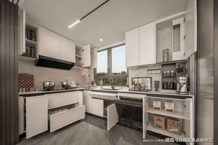 柏厨 (或同等档次品牌)的定制柜体,整体橱柜哑光吸塑延续造型翻边设计,很好的提升空间流线感。厨房电器配置了方太(或同等品牌系列)三件套(抽烟机、燃气灶和洗碗机)。洗碗机配置了12套容量大小,洗排烘消存(洗碗、排水、烘干、消毒、存储)一体,完全可以满足5人以上家庭成员的餐具清洗。