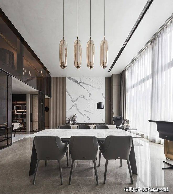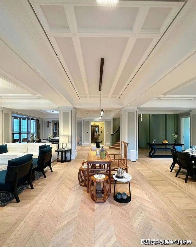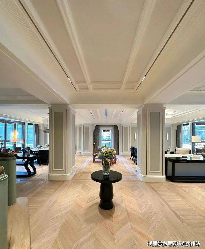 走进 363㎡的户型,空间的开阔感扑面而来 。一踏入屋内,首先映入眼帘的便是宽敞明亮的客厅,约 8 米的超大面宽,搭配全景落地窗,让阳光毫无保留地倾泻而入 ,整个空间显得格外通透明亮。在这里,您可以与家人围坐在一起,享受温馨的家庭时光;也可以邀请朋友前来聚会,宽敞的空间足以容纳欢声笑语 。客厅连接着景观阳台,站在阳台上,浦江两岸的壮丽景色尽收眼底,让您仿佛置身于一幅美丽的画卷之中 。餐厅与客厅一体化设计,空间连贯流畅,方便家人用餐和交流 。餐厅旁的西式厨房,配备了顶级的嘉格纳厨电,无论是烹饪精致的西餐,还是制作丰盛的中餐,都能让您尽情展现厨艺 。中厨采用封闭式设计,有效地隔绝了油烟,同时也保证了厨房的整洁和卫生 。