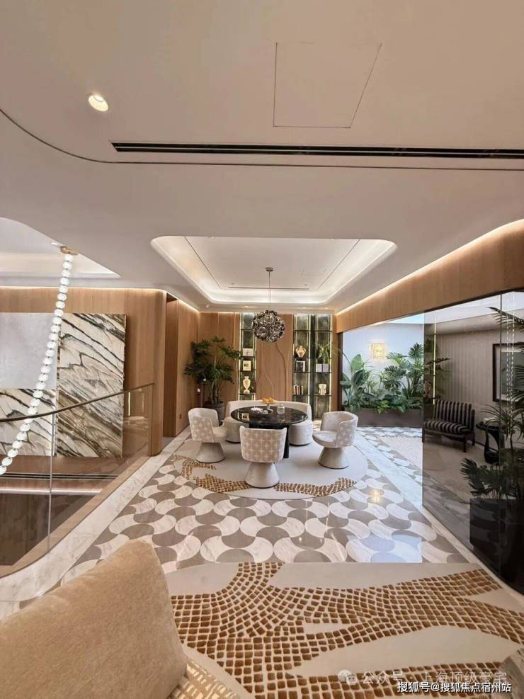 比如,半标无边界泳池以渐变马赛克墙面、水波纹感天花与透景玻璃幕墙,将下沉庭院景致融入其中,这处可游憩的水下艺境,就是一座美术馆级的美学场域。