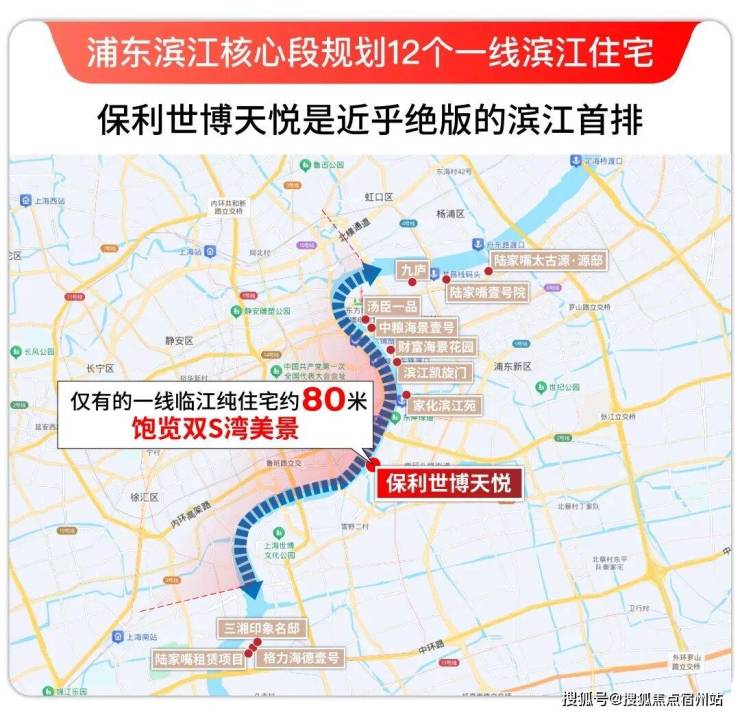 保利·世博天悦,站位世博滨江板块核心,与黄浦江边直线距离仅约80米,地段价值不言而喻。