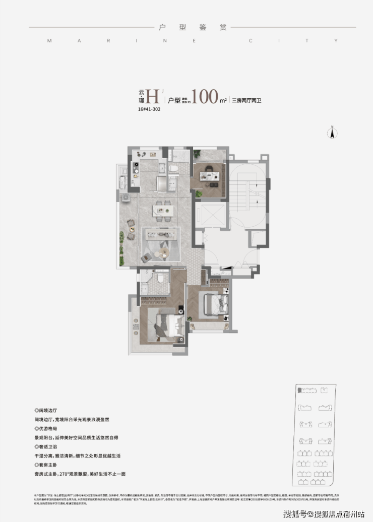 同样是3房2卫的配置,功能性与舒适度兼具。该户型惊艳的地方在于大尺度的景观边厅设计,搭配超大阳台,营造IMAX级别的客厅景观面,极具阔绰感!
