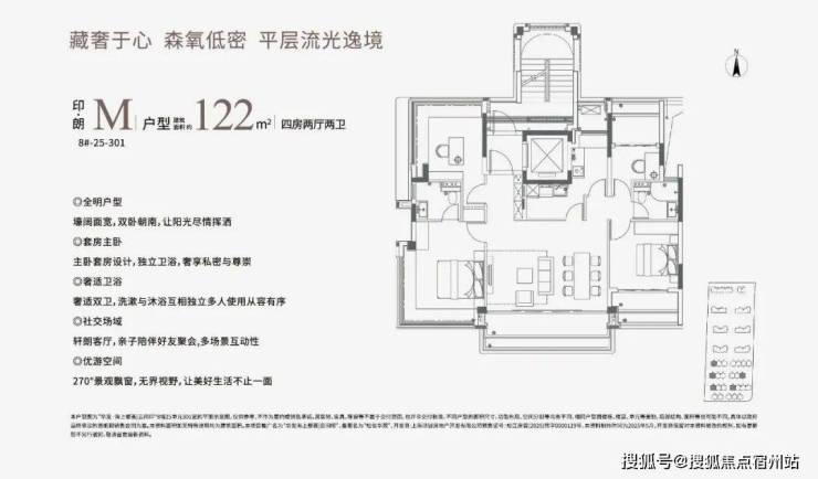 建面约122㎡的中叠四房,大平层式设计,宽尺横厅+阳台+270°主套飘窗采光条件极佳,每天早晨都被阳光晒醒。