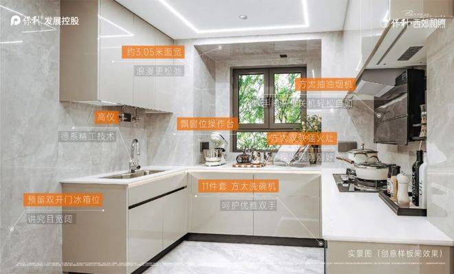 U型厨房带飘窗的设计,左侧预留了 双开门冰箱位置,让整个空间的利用率更高。