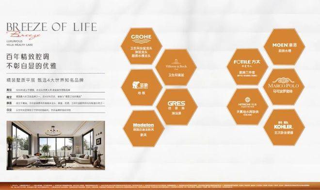 项目精装交付标准更是诚意满满。 中央空调、地暖、新风三大件配齐,还采用了 高仪、唯宝、科勒等国际知名品牌,整体装修品质有保障。