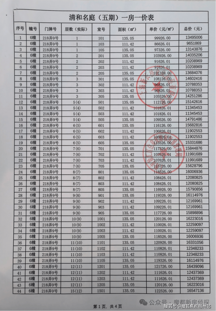 最新一房一价表公示 :