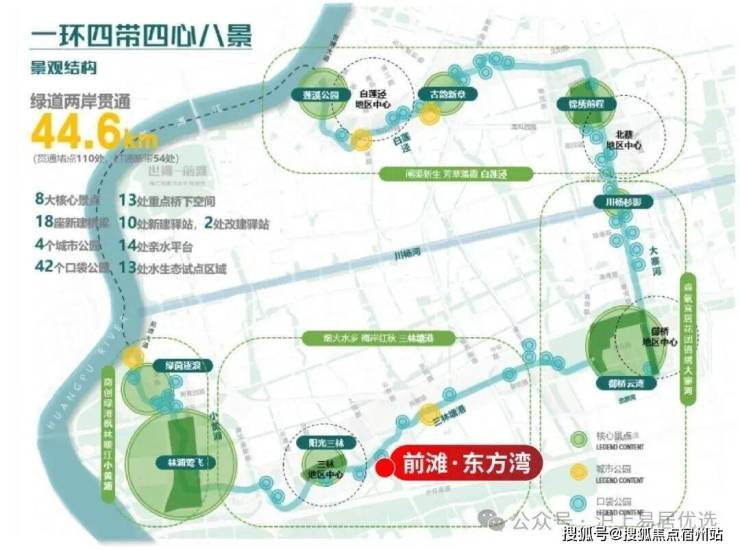 周边 前滩友城公园、前滩体育公园、东明公园 等已建成公园, 三林塘港、“林浦莺飞”、“绿茵逐浪” 等核心景点将连缀成片,形成气势磅礴的滨水公园带。