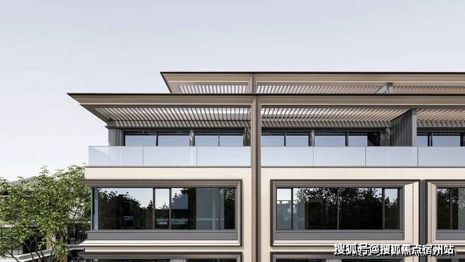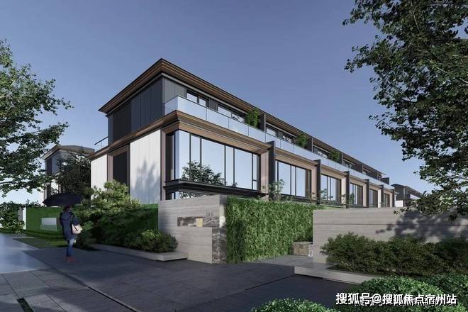 叠墅立面采用大面积玻璃,局部石材+铝板线条,山墙区域为涂料!