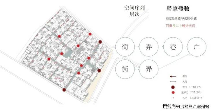 士林润园社区规划可分为蓬莱路城市公共景观以及社区内部景观两个部分,其中市政绿地衔接于上海2035城市总体规划中“蓝绿丝带”的上位条件要求,社区内部街巷空间形成空间序列形成递进的层次,将归家体验的序列依次展开,形成城市街道→入口(一级门户)→街巷→节点空间→里弄门(二级门户)→合院入户(三级门户)的方式,基本可保证大多数住户可体验到两重以上的空间递进。