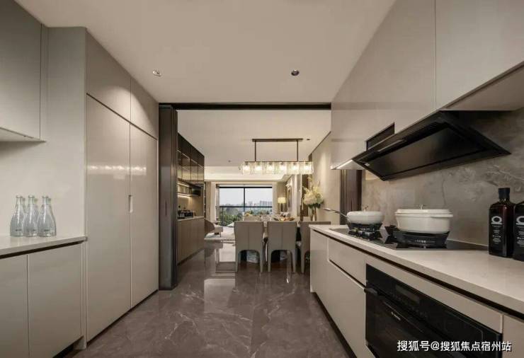 比如,为保证餐厅的整体性,厨房的墙体与门均采用了金属拉丝玻璃,关上后形成一个完整的背景,达到舒适的视觉效果。