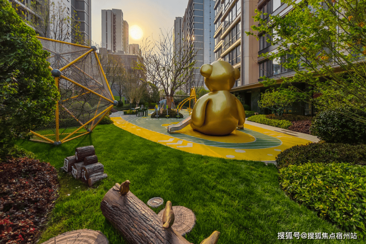 六大林系主题生活花园也是实景,包含中央阳光草坪与会客廊架、儿童主题活动区及四大全龄架空层等,一方面景观丰富,另一方面触发业主更多的停留和遇见的可能性,让社交在自然而然中发生。