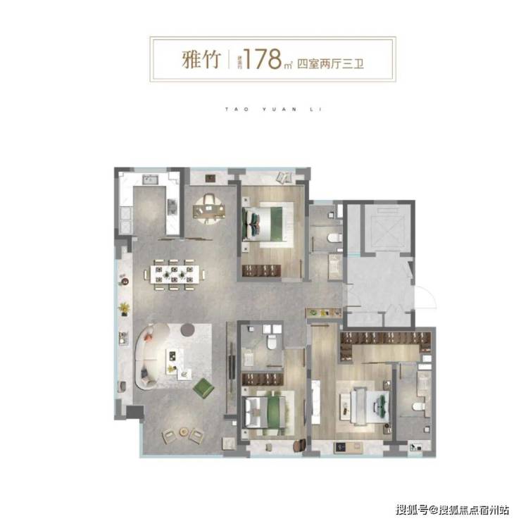 针对终极改善家庭,178㎡四房户型配备独立书房、步入式衣帽间及270°环绕式取景客厅。