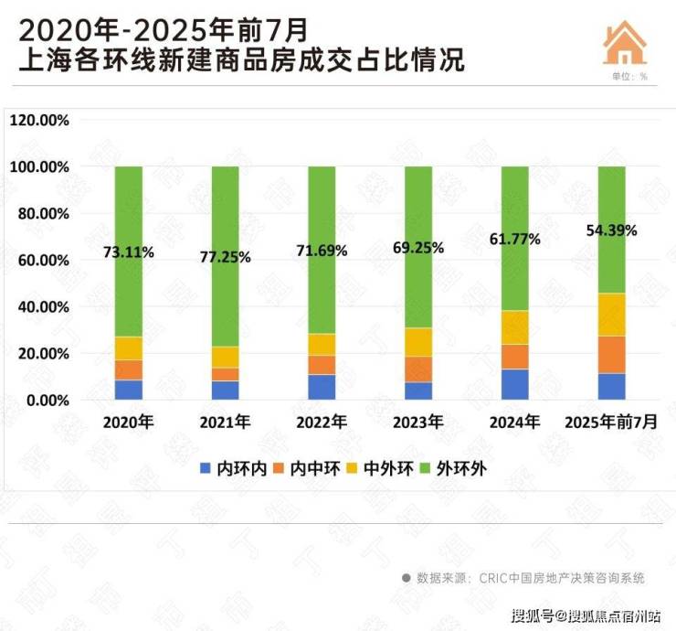 值得注意的是,上海外环外一直是新房供应和成交的主力,其中一手房供应和成交占比近五年都在一半以上,今年前7月外环外新房成交188.31万平方米,占比为54.39%。从趋势来看,2021年以来外环外成交占比逐年下降。