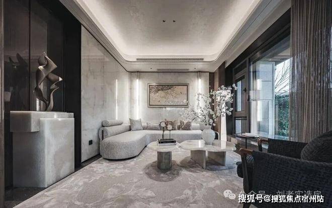 首先是奢石含量极高,从入户处的玲珑玉拼花与透光云石辉映,到翡翠绿奢石墙景、再到发光云石装饰点亮归家路,石材的典雅贯穿始终。