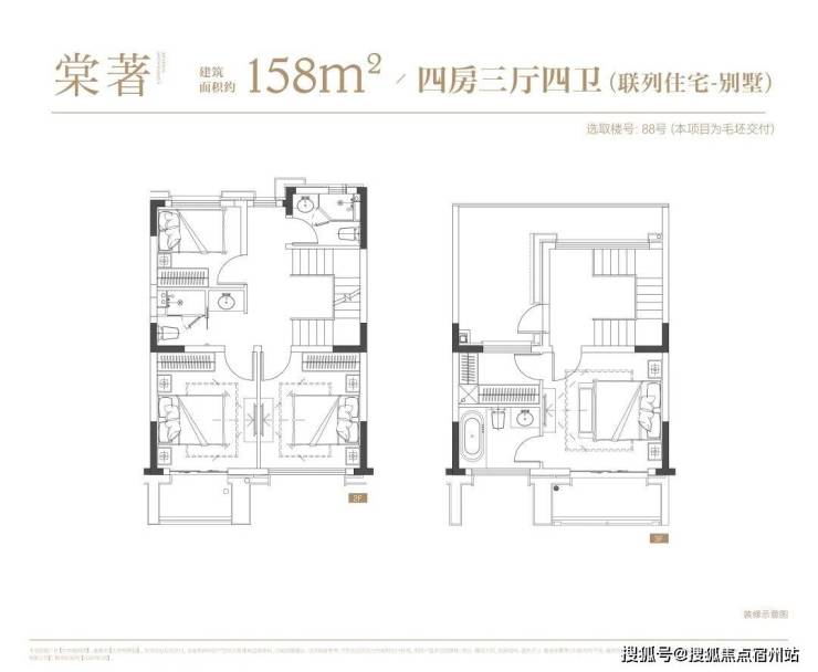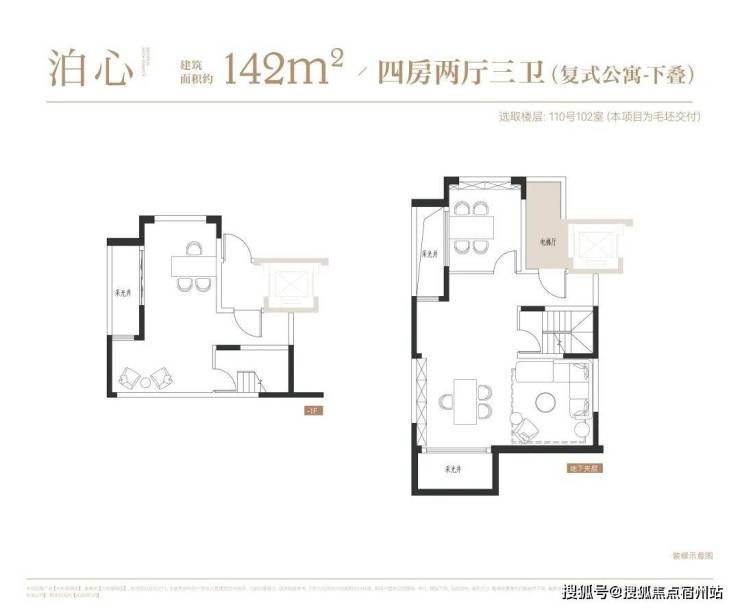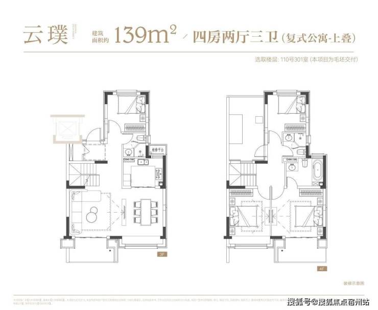叠墅:叠墅一共四层,分为上/下叠,上叠建筑面积约139㎡,下叠建筑面积约142㎡。