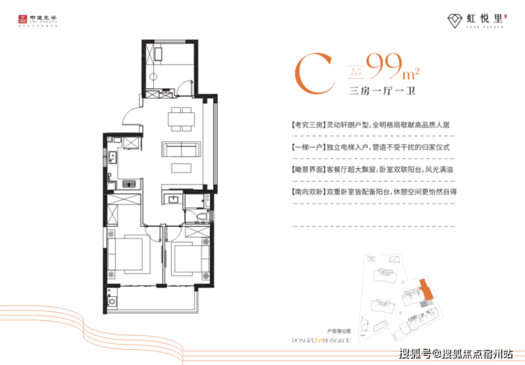 户型上79㎡两房,99㎡三房,装修上, 中央空调、地暖配齐,并选用科勒、耶鲁、马可波罗、欧派、方太、安吉尔等品牌。