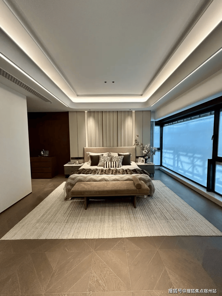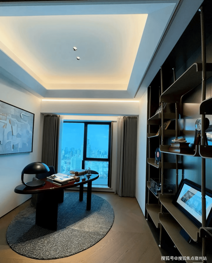 走进建面约491㎡的样板间,你会感受到一种超越尺度的震撼。约 3.45米的层高 、约 16米长的跑道式阳台 、 270度的转角落地窗 ,共同营造出一种睥睨天下的气度-1-2。