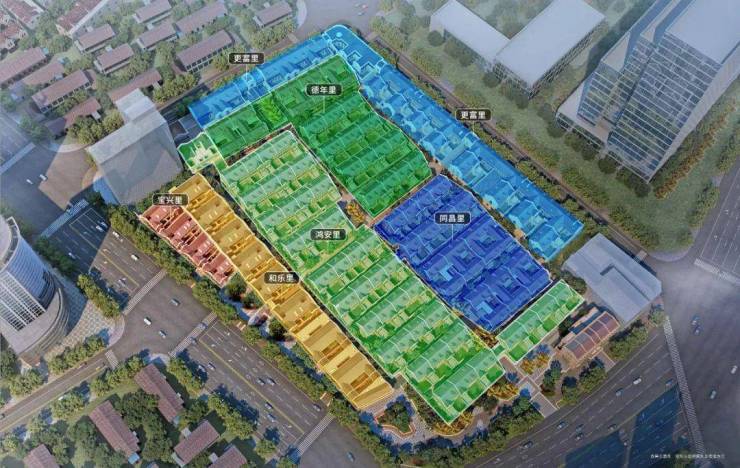 弘安里对宗地的各个时期的石库门进行甄别分类,建档存图,创新“保护修缮、保留改造、更新改建”一栋一策,进行风貌更新。在土地肌理的延续再造中,充分保留了地块原有8个里弄间“行列式”的肌理布局,和原始主、支弄的形态和组团特征,根据现代人的生活需求,优化再组为6个新组团。