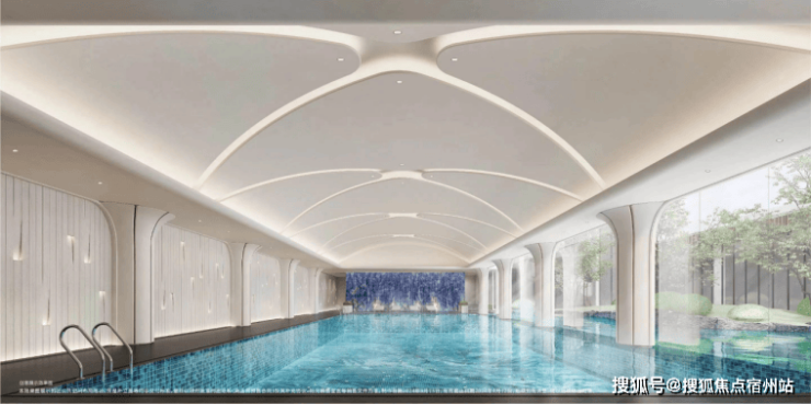 恒温泳池约500㎡艺术馆般泳池,天花、墙面以现代摩登的手法,抽取上海海派建筑造型为元素,✅✅招商臻境售楼处电话:400 - 8824 - 258✅✅打造充满静奢韵律的造型,搭配泳道尽端景泰蓝奢石背景墙,勾勒出一处臻享静美的精神之所。