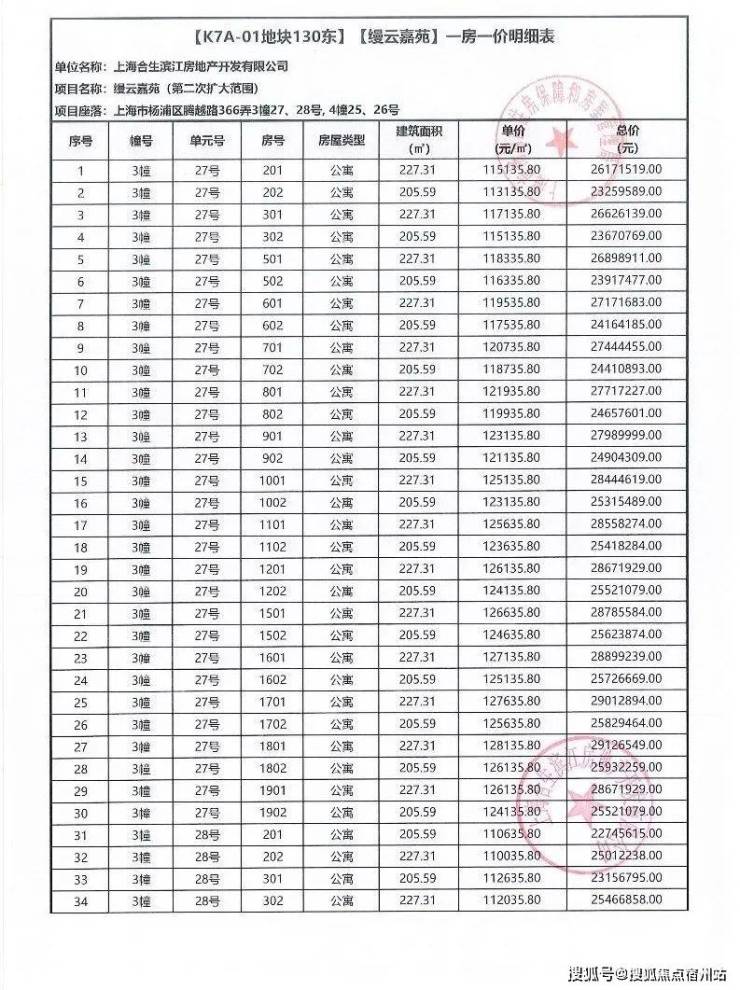 一房一价表如下