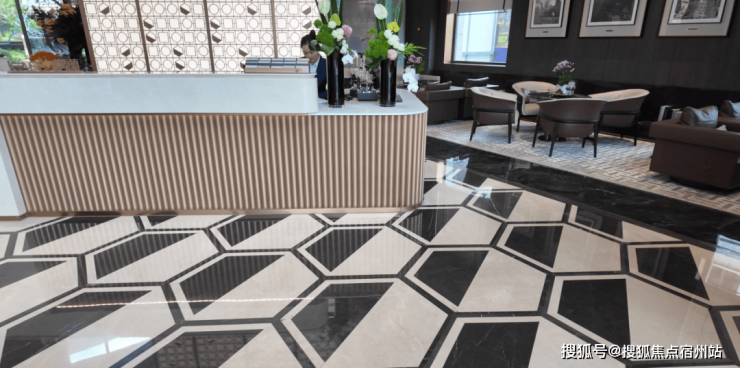 接着走进售楼处, 这里也是未来社区出入的前厅,延续了别致的海派腔调。地面是融入玉兰花标志的海派拼花,采用昂贵的香格里拉黑石材,墙面则用上了稀缺的奥特曼米黄、莫奈花园奢石。