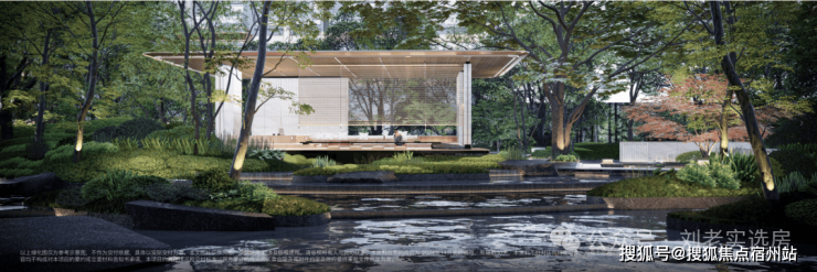 第三重,下沉式的中庭花园,⽔境、浮岛、密林,构建都市中的谧境,摩登的水院,华灯映入水池,映出池底的金光色,雍容华贵,畅享宁静;