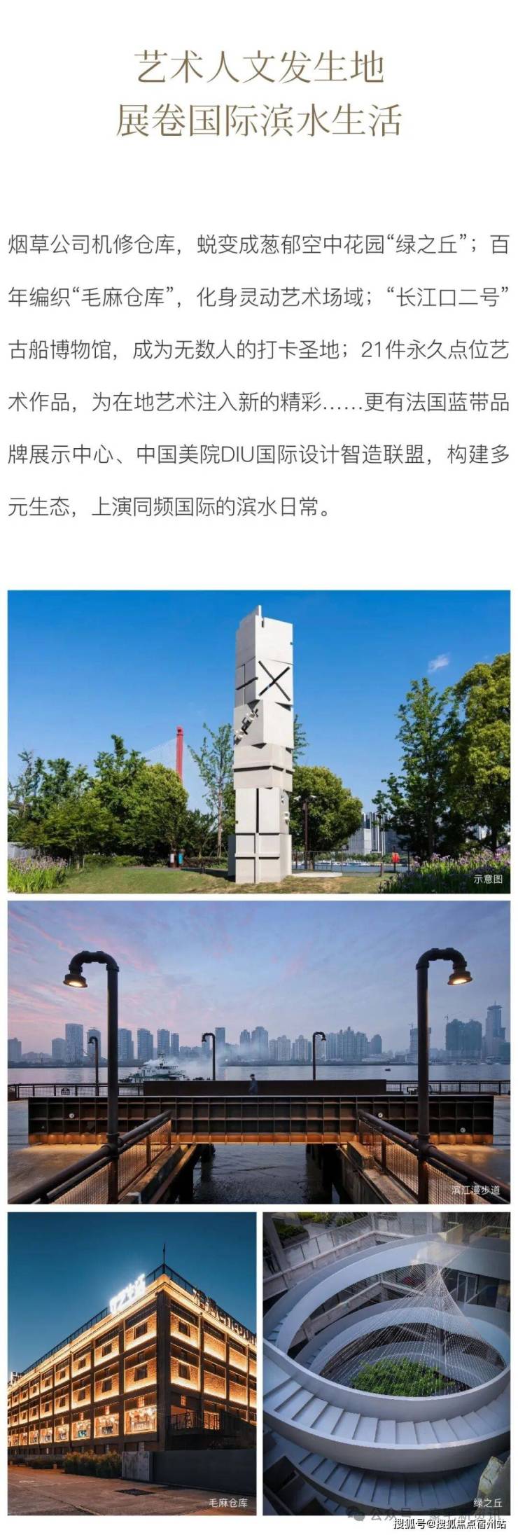 板块内独特的丰富的历史文脉“遗产”将转换成时尚的人文休闲资源。板块内公共绿地约48.46公顷,滨江跑道、步道、骑行道现已全线贯通,使此地成为集合品牌策展、网红打卡、运动休闲等功能于一体的文创休闲带。